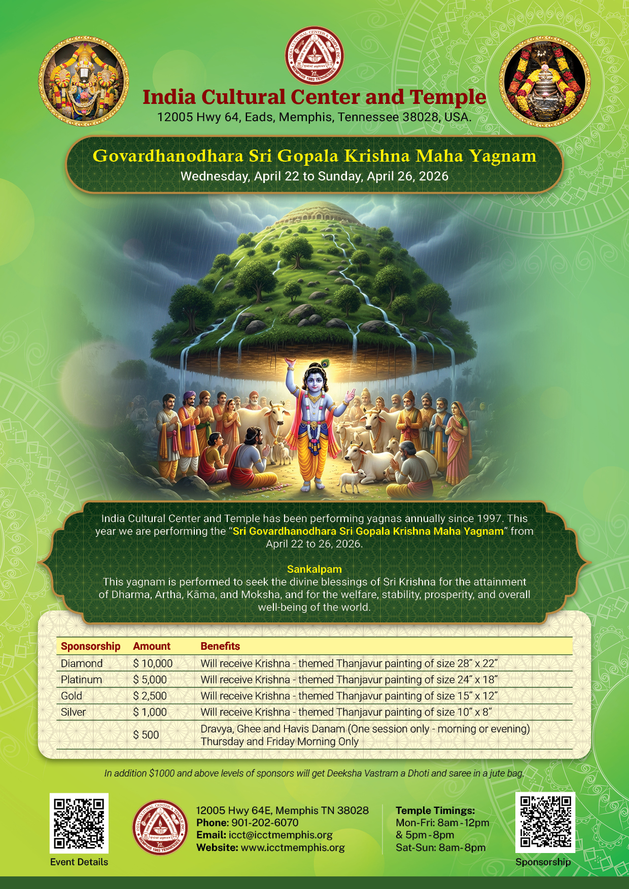 India Cultural Center and Temple has been performing yagnas annually since 1997. View a list of all previous yagnams here. This year we are performing the “Sri Govardhanodhara Sri Gopala Krishna Maha Yagnam” from April 22 to 26, 2026.