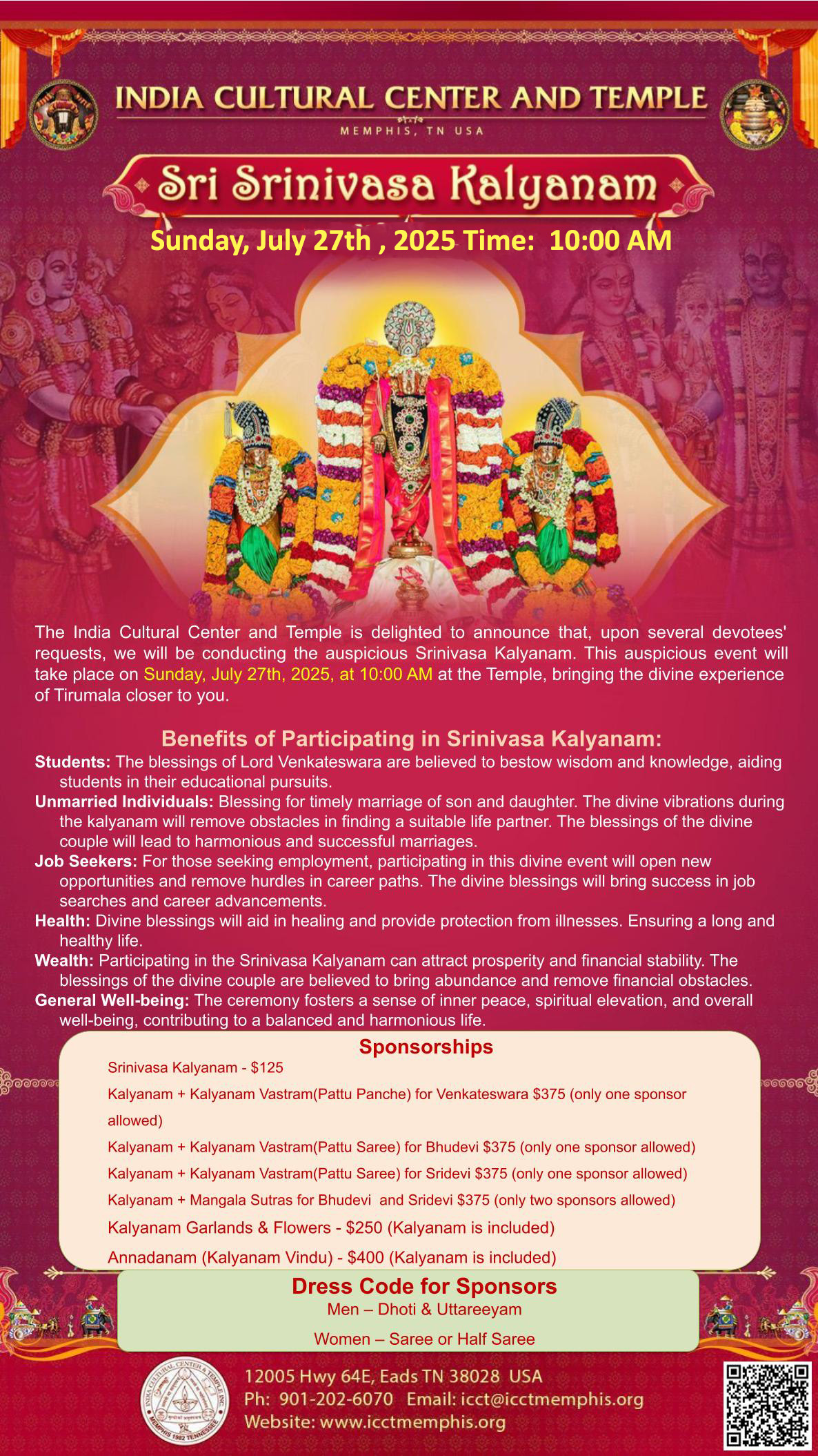 Traditional Indian dress (dhoti for men and saree for women) for devotees participating in Srinivasa Kalyanam. Please refer Temple Etiquette for additional details on the dress code.